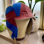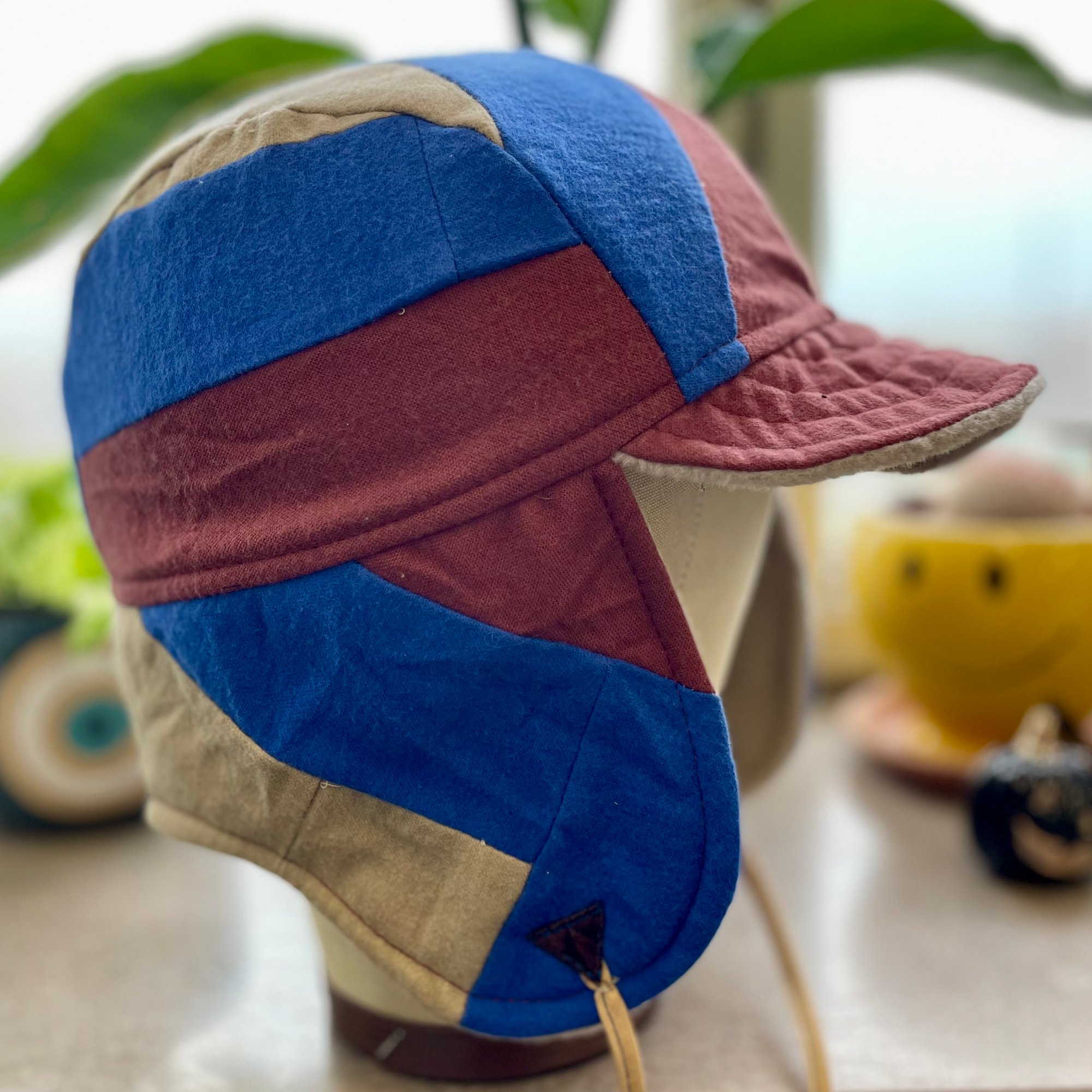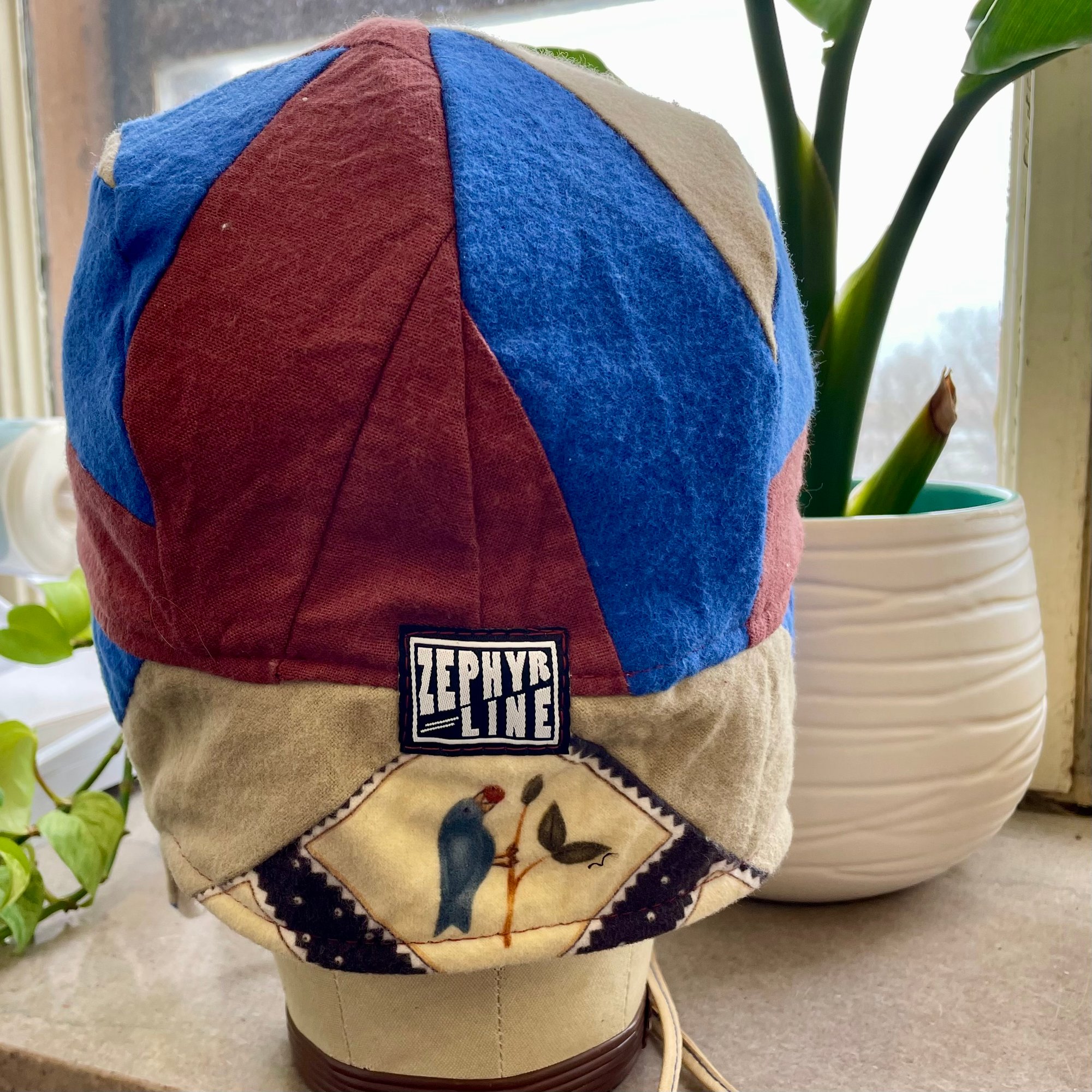 This version in rich Prussian blue and warm rust is made from a forgotten flannel Log Cabin quilt square, with a sweet songbird on the rear neck. Oatmeal fleece lining and a soft quilted brim. Generous ear flaps can be worn down to protect ears and cheeks, or tied upon the crown with ties anchored to antique uniform triangles.