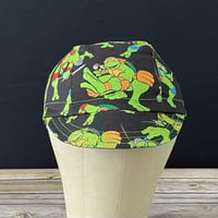 80s kid? Still jazzed when you hear the Teenage Mutant Ninja Turtles theme? Here’s your fave four in action on a black background . Made of lightweight cotton and fits comfortably under a bike helmet.