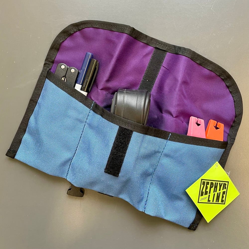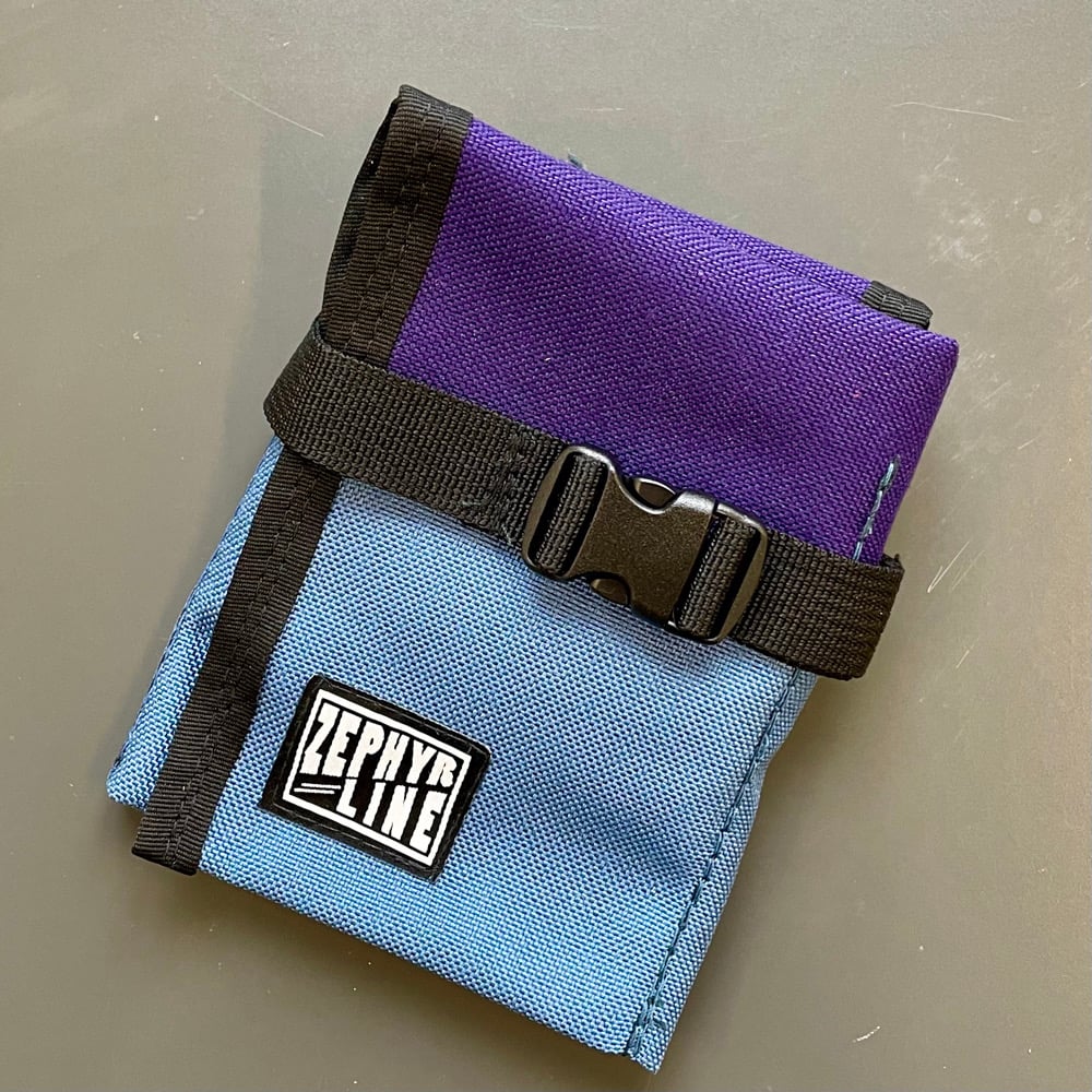 This version is made with deep plum and blue Cordura from a former messenger bag maker; lined with purple poly flag material.
