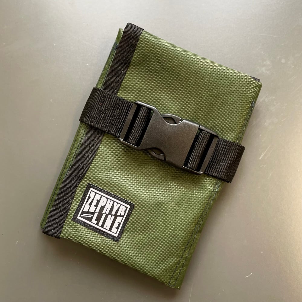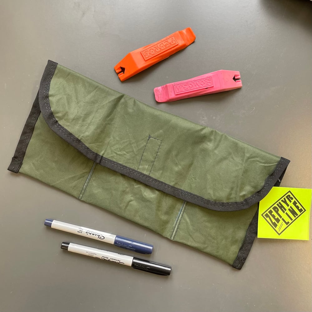This version is made with locally sourced decommissioned US military rubberized dry-bag nylon in olive drab ; lined with fuschia poly flag material.